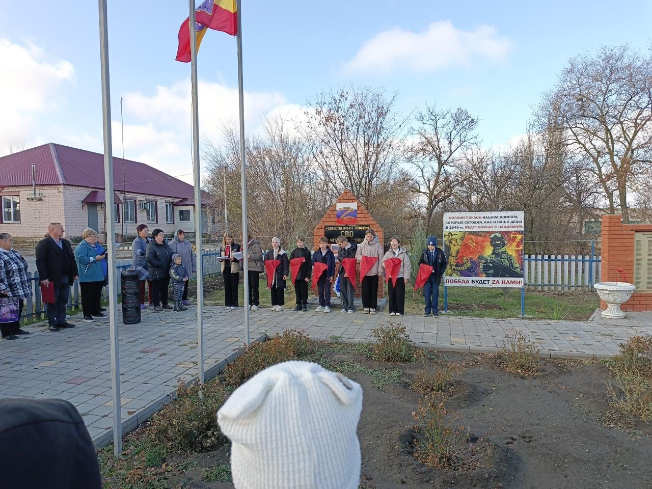 Ведущие мероприятия Александрова Валентина и Малахова Екатерина напомнили всем о наших земляках, которые сегодня находятся на передовой и защищают каждый день нашу мирную жизнь. Степанова Дарья и Фетисова Маргарита провели прием в пионеры и прочли слова благодарности героям нашей родины за мирное небо над головой. Торжественно-траурный митинг завершили памятными фото.